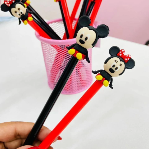 Uma caneta inspirada na personagem Minnie traz um design encantador e elegante, perfeito para fãs da icônica personagem Disney. No topo da caneta, encontra-se uma miniatura tridimensional do corpo da Minnie, capturando sua pose graciosa e icônica. A figura apresenta seu vestido com bolinhas, seus sapatos amarelos brilhantes e, claro, sua tiara com o laço vermelho marcante. O design é detalhado, refletindo a personalidade charmosa e alegre da personagem.